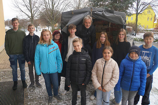 Der Schülerrat half euphorisch dabei, sie in den Anhänger zu laden in dem sie nach Rumänien transportiert werden.