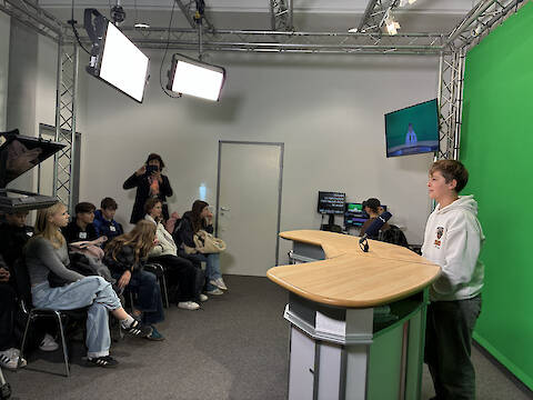 Ein besonderes Highlight war der Besuch im Kleiderfundus, wo die Schüler verschiedene Kostüme anprobieren konnten. An der Green-Screen-Station durften sie selbst Effekte ausprobieren und sogar als Nachrichtensprecher vor die Kamera treten.