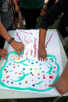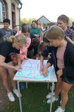 Abschließend überreichte Herr Reinhardt das am Anfang gestaltete gemeinsame Bild an Frau Dießner mit einem kurzen Rezept, was es benötigt um Gemeinschaft zu kreieren: