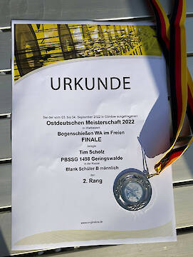 Unser Schüler Tim Scholz aus der 6. Klasse war am 03.09.2022 zur 20. Ostdeutschen Meisterschaft in Glindow bei Berlin. Dabei trat er gegen 7 weitere Schützen seines Alters und Bogenklasse an und wurde Vizemeister.