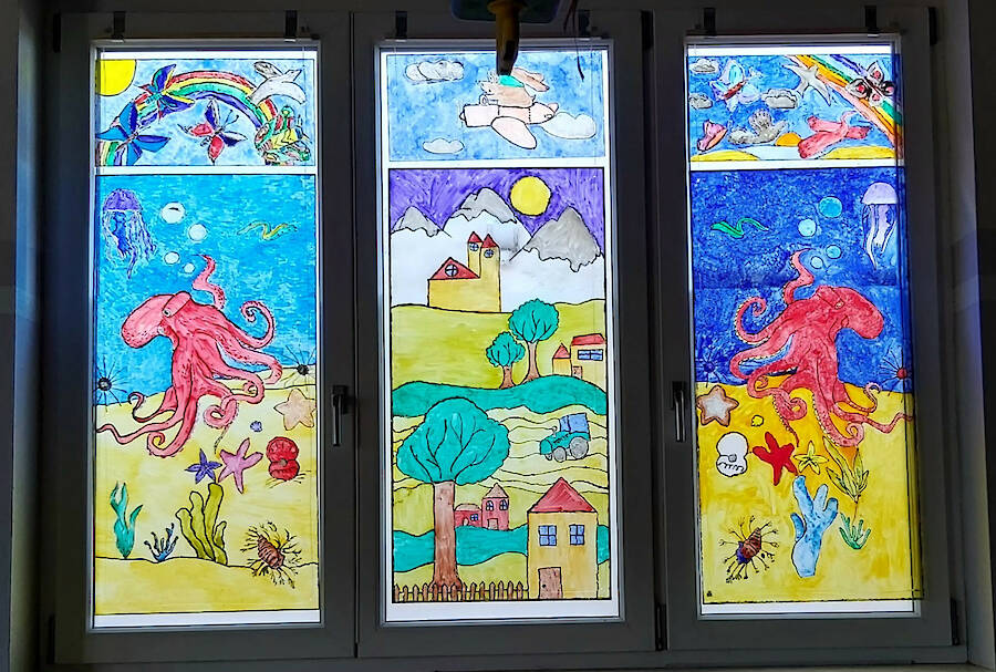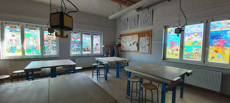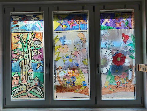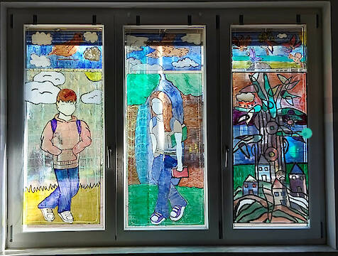 Endlich ist es geschafft: Die Fensterbilder hängen im Kunstraum. Bis vor wenigen Wochen gab es da nur zwei Bilder, die bereits vor Corona von einer ehemaligen Schülerin entworfen und einer neunten Klasse fertiggestellt worden waren. Jetzt sind alle Fenster im Kunstraum bestückt. Die Schülerinnen und Schüler beider gegenwärtig achten Klassen unserer Schule haben diese Kunstwerke eigenhändig entworfen und fertiggestellt. „Nur die Themen habe ich vorgegeben und die Jugendlichen im Umgang mit den Glasmalfarben angeleitet. Ich bin wirklich stolz darauf, was diese Klassen geschaffen haben.", sagt Kunstlehrerin Ulrike Krause.
