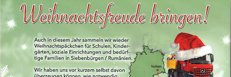 Auch dieses Jahr haben wir uns wieder an der Aktion "Weihnachtsfreude bringen" der Interessengemeinschaft Rumänienhilfe beteiligt und Weihnachtspäckchen für Schulen, Kindergärten, soziale Einrichtungen und bedürftige Familien in Siebenbürgen/Rumänien gesammelt.