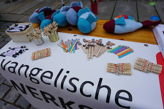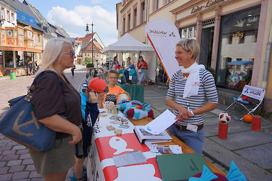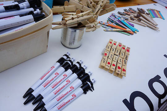 Die Werkschule nutzte die Gelegenheit interessierten Bürgern das Konzept der Schule sowie die Berufsorientierung vorzustellen. Unterstützt wurden Frau Köhler, verantwortlich für die Öffentlichkeitsarbeit der Werkschule, und Frau Pumpol, die Praxisberaterin der Schule, von zwei fußballbegeisterten Schülern, die die Spende entgegennahmen.