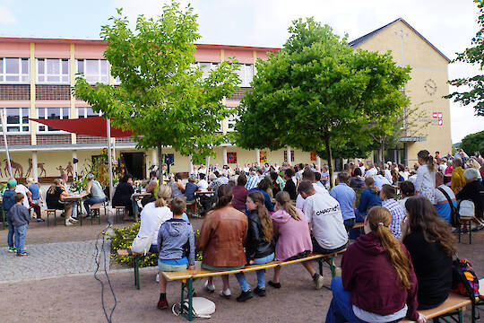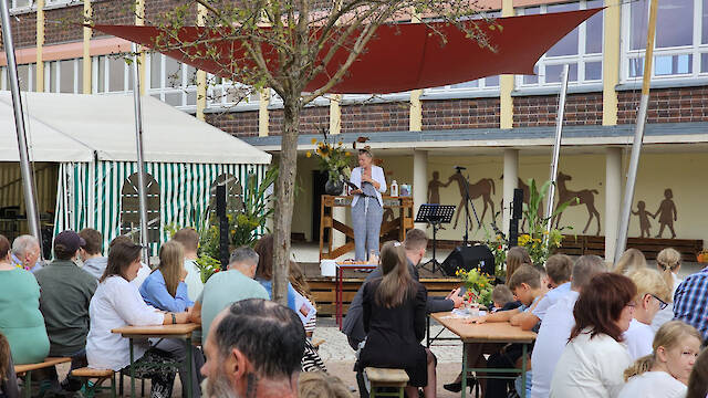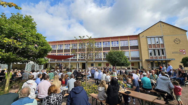 Zu Beginn begrüßte unsere Schulleiterin, Frau Dießner, die neuen Schülerinnen und Schüler sowie deren Familien herzlich auf dem Schulhof. Im Anschluss daran stimmten alle gemeinsam in ein fröhliches Lied ein, das die Vorfreude auf den neuen Lebensabschnitt musikalisch untermalte. Für eine weitere besondere musikalische Umrahmung sorgte Frau Weidmüller, die mit einem eindrucksvollen Beitrag den Gottesdienst bereicherte.